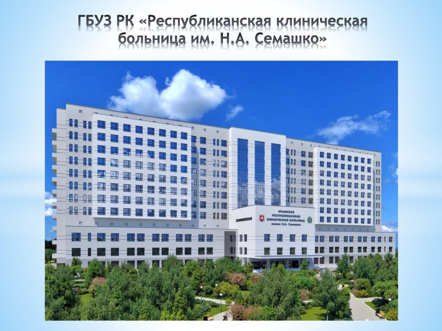 ГБУЗ РК «Республиканская клиническая больница им. Н.А. Семашко» является многопрофильным высококвалифицированным медицинским учреждением, которое под непосредственным руководством Министерства здравоохранения Республики Крым и при поддержке правительства и государства выполняет лечебно-диагностическую, научную и учебно-методическую работу для жителей Крыма и России. В декабре 2020 года был сдан в эксплуатацию новый корпус, располагающийся на 12-ом км Московского шоссе, оснащенный по последнему слову медицинской техники.