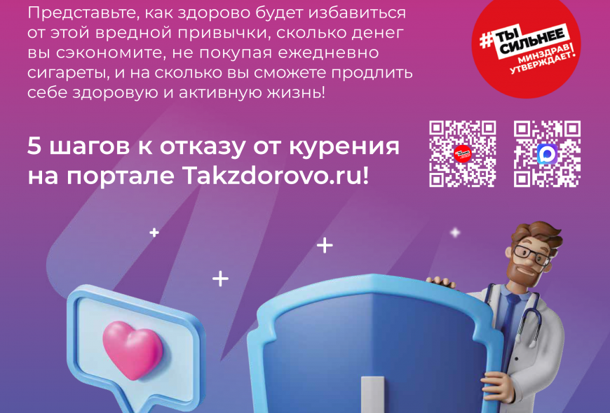Министерство здравоохранения Российской Федерации в целях усиления информационной работы по повышению грамотности населения в вопросах здоровья, профилактики заболеваний и формирования здорового образа жизни направило обновлённые рекламно-информационные материалы. Мера реализуется во исполнение указания Министра здравоохранения РФ М. А. Мурашко. Материалы разработаны для официального интернет-портала Минздрава России о здоровом образе жизни Takzdorovo.ru. Их ключевой особенностью стало наличие QR-кода, при сканировании которого пользователь попадает на официальный канал Минздрава России в социальной сети «МАХ». Использование QR-кода позволяет максимально упростить для граждан процесс перехода на официальный канал Минздрава, где регулярно публикуются новости, рекомендации врачей, информация о диспансеризации и другие важные материалы. Ознакомиться с обновленными материалами и получить проверенную информацию о сохранении здоровья можно на Портале Takzdorovo.ru и в социальной сети «МАХ».