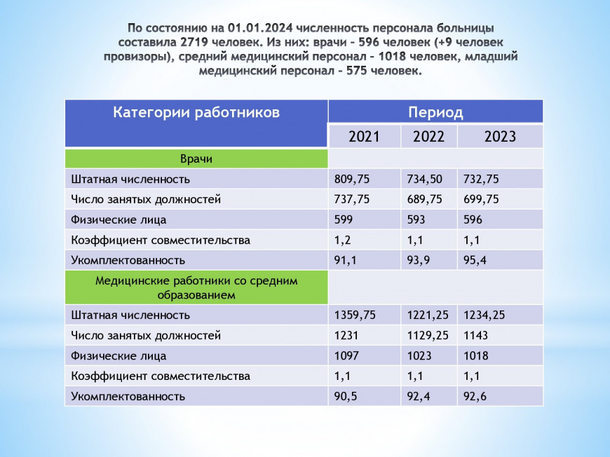 Большая часть врачей и средних медработников являются специалистами высшей категории. В больнице трудятся 8 Заслуженных врачей Украины, 23 Заслуженных врача РК, 7 Заслуженных работников здравоохранения, более 150 награжденных Почетными грамотами и знаками отличия, 34 доктора и кандидата медицинских наук, 23 главных специалиста Минздрава РК.